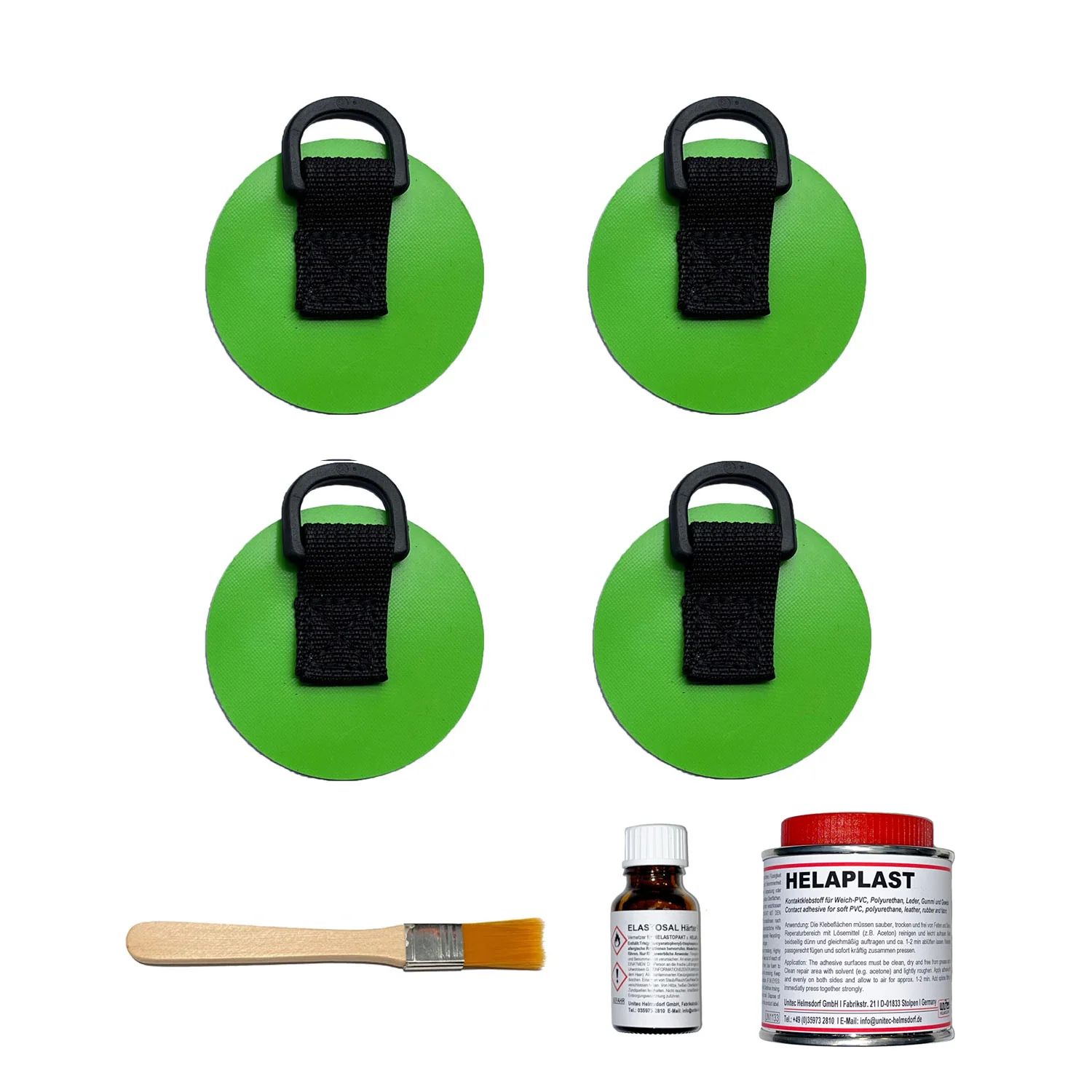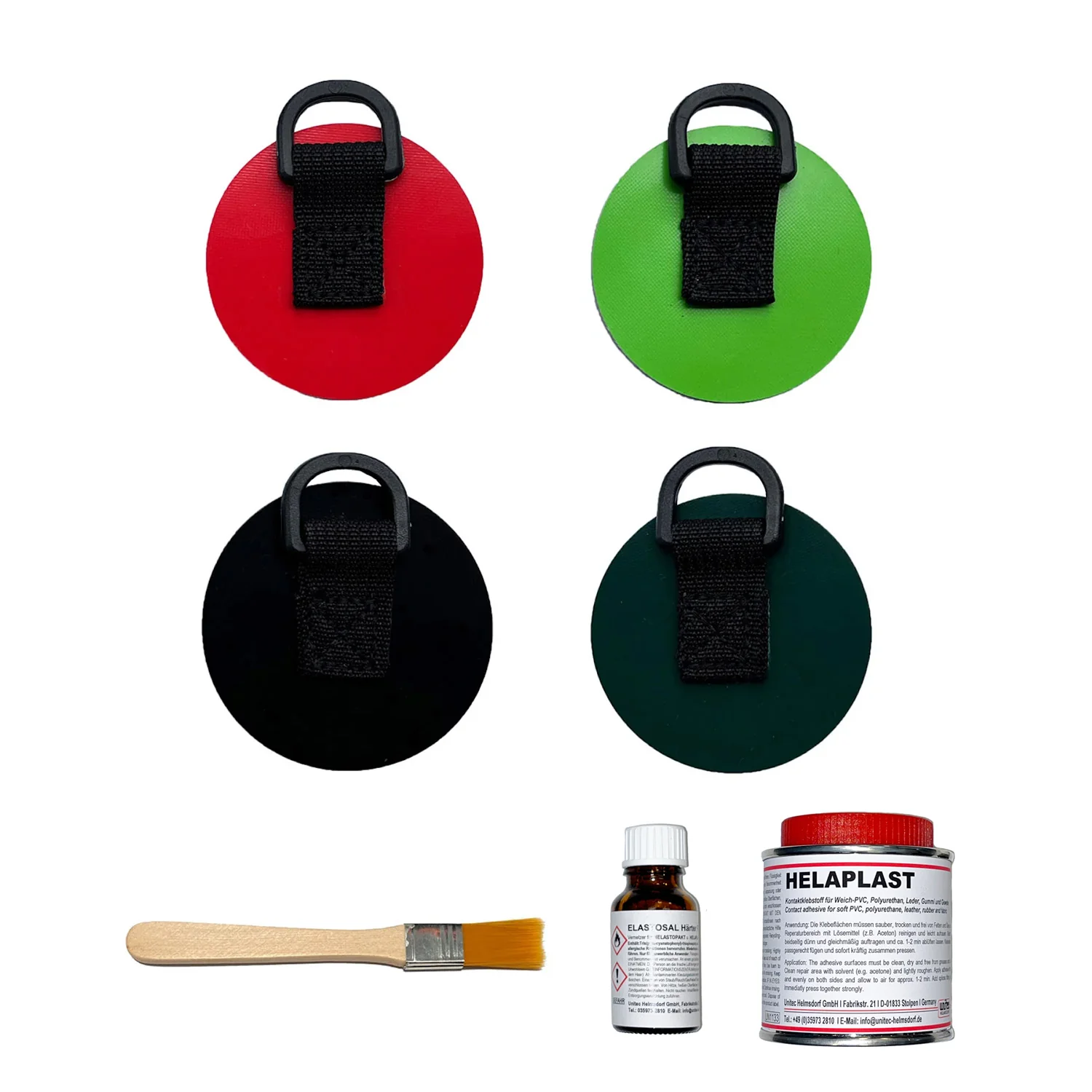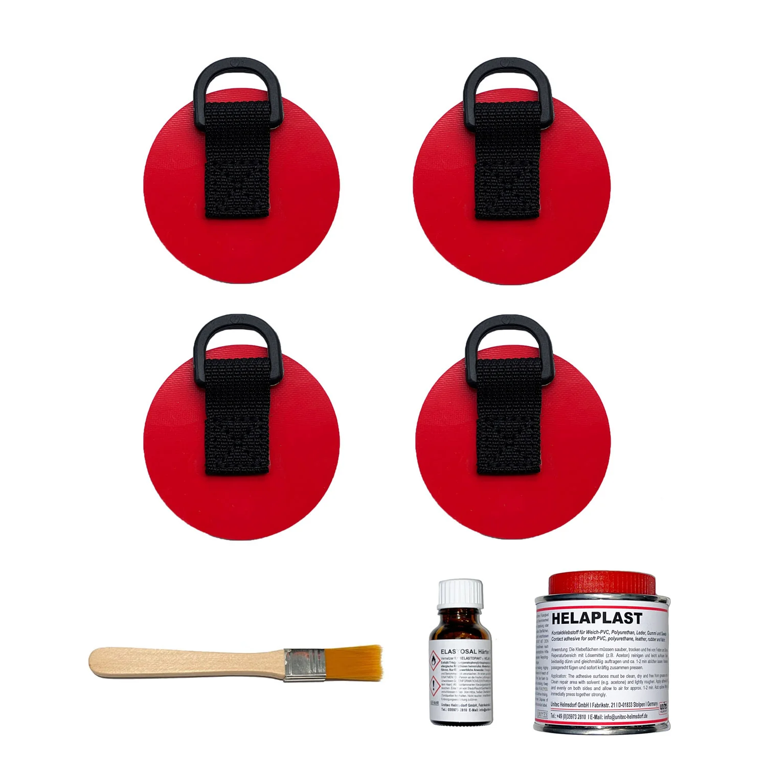Unsere Meinung: Dieses Set enthält alles was man benötigt um D-Ringe zur Befestigung eines Bootswagens auf ein Gumotex Boot aufzukleben.