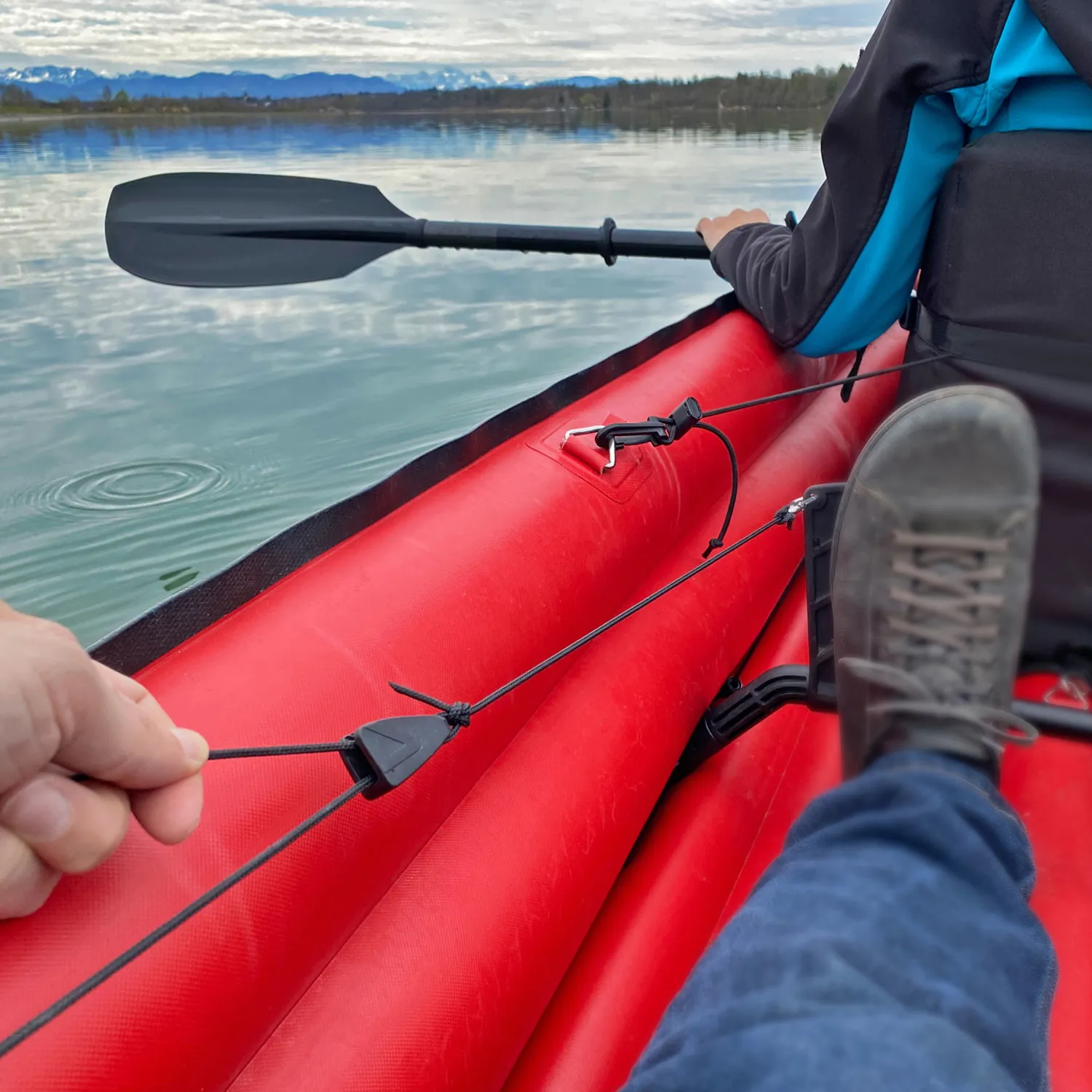 Mit den Edelstahl-Karabinern können die Steuerleinen beim Aufbau schnell verbunden werden. Die Steuerleinen können nach erstmaligem Aufbau im Boot eingezogen bleiben.